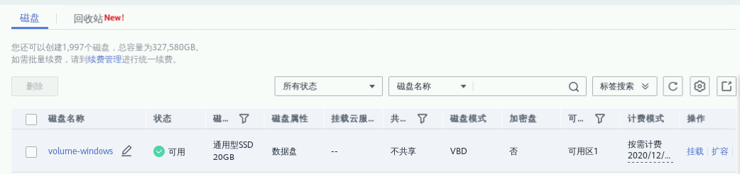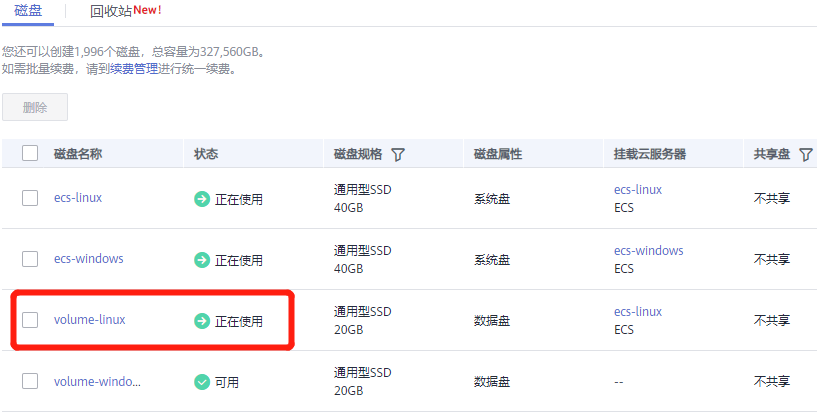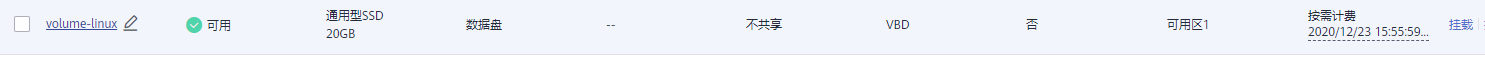 单独购买的云硬盘EVS为数据盘,可以在云硬盘EVS列表中看到磁盘属性为“数据盘”,磁盘状态为“可用”。此时需要将该数据盘挂载给弹性云服务器ECS使用。