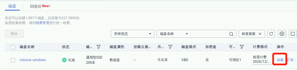 在云硬盘EVS列表,找到我们所创建的云硬盘,然后点击右侧操作中的【挂载】,弹出挂载磁盘配置窗口完成配置就行
