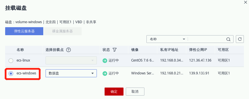 选择云硬盘EVS待挂载的弹性云服务器ECS,此处我们选择ecs-windows,该弹性云服务器ECS必须与云硬盘EVS位于同一个可用分区哈这个前面我已经讲过的,通过下拉列表选择“挂载点”,挂载点是数据盘,单击“确认”;