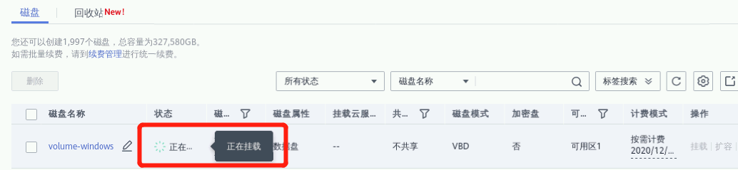 返回云硬盘EVS列表页面,此时云硬盘EVS状态为“正在挂载”,表示云硬盘EVS处于正在挂载至弹性云服务器ECS的过程中,当云硬盘EVS状态为“正在使用”时,表示挂载至弹性云服务器ECS成功,下一步进行初始化就能正常使用啦;