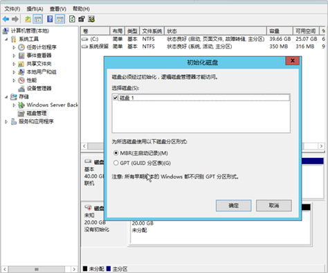 在左侧导航树里面,选择 存储 –> 磁盘管理,进入“磁盘管理”页面,假如新挂载磁盘显示为“没有初始化”,则右键单击在菜单列表中选择“初始化磁盘”。在“初始化磁盘”对话框中显示需要初始化的磁盘,选中“MBR(主启动记录)”或者“GPT (GUID 分区表)”,单击“确定”完成设置