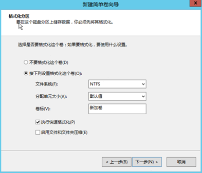 勾选“按下列设置格式化这个卷”,并根据实际情况设置参数,格式化新分区,单击“下一步”完成分区创建
