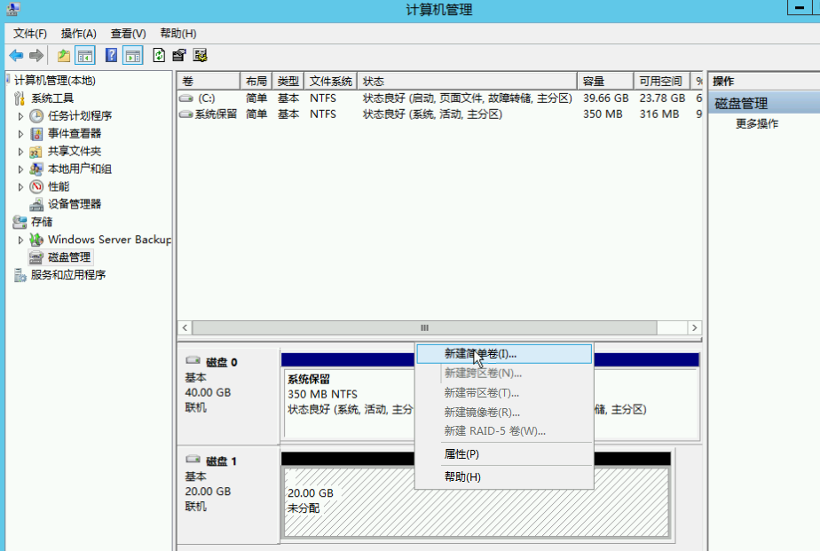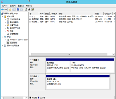 在弹性云服务器ECS桌面,页面下滑选择“开始”,然后在菜单列表里面选“服务器管理器”,然后文件和存储服务->磁盘->工具 -> 计算机管理页面;