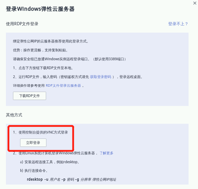 使用其他方式(VNC)登录,点击“立即登录”这个简单,第一种要下RDP文件麻烦一点,要绑定弹性公网EIP 放弃哈哈