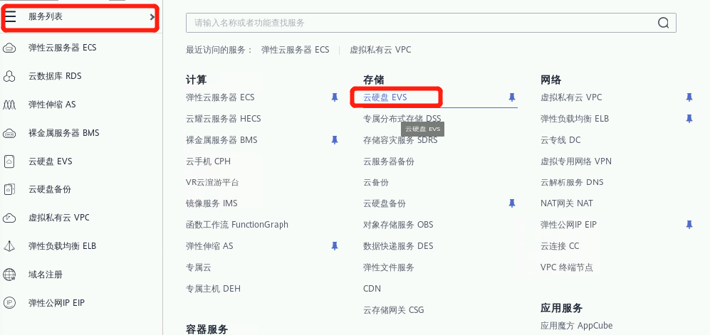 云硬盘EVS挂载至弹性云服务器ECS后,需要登录弹性云服务器ECS初始化云硬盘EVS,即格式化云硬盘EVS,之后云硬盘EVS才可以正常使用,选择“服务列表>弹性云服务器ECS”。进入弹性云服务器ECS页面;
