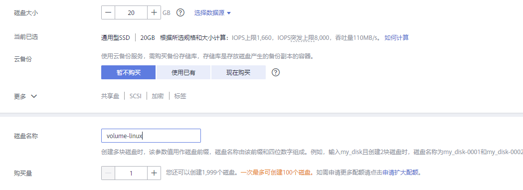 在云硬盘EVS列表,找到我们所创建的云硬盘volume-linux,点击右侧操作中的【挂载】,弹出挂载磁盘配置窗口