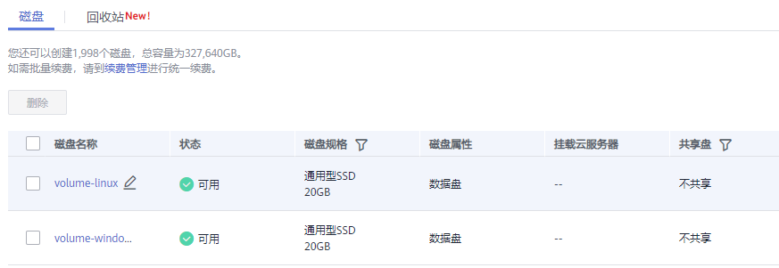 返回“磁盘列表”。在“云硬盘EVS”主页面,就能查看云硬盘EVS状态,待云硬盘EVS状态变为“可用”时,表明创建成功,并且可以进行挂载及扩容操作;