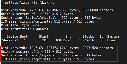 表示当前的弹性云服务器ECS有两块磁盘,“/dev/vda”是系统盘,“/dev/vdb”是新增数据盘