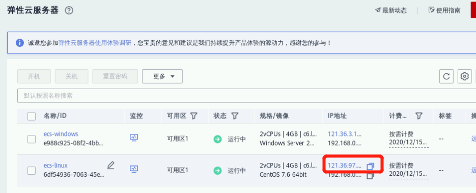 复制名称为“ecs-linux”的弹性云服务器ECS的弹性公网IP