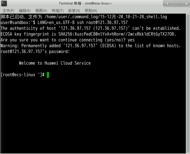 回到【实验操作桌面】,双击“Xfce终端”打开Terminal,执行如下命令(使用弹性公网IP地址替换命令中的EIP),登录弹性云服务器ECS