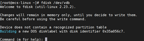 执行下面命令,进入fdisk分区工具,开始对新增数据盘执行分区操作,fdisk新增数据盘,以新挂载的数据盘“/dev/vdb”为例: