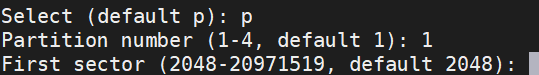 “First sector”表示初始磁柱区域,我们可以选择2048-20971519这个范围,默认为2048;还是以选择默认初始磁柱编号2048为例,不输入命令,直接按回车键“Enter”即可啦;