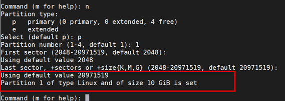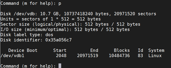 上面表示分区完成,即为10GB的数据盘新建了1个分区,然后输入“p”,按回车键“Enter”,就能查看新建分区的详细信息;