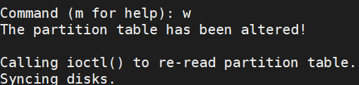 表示新建分区“/dev/vdb1”的详细信息,输入“w”,按回车键“Enter”,可以把分区结果写入分区表里面去啦;