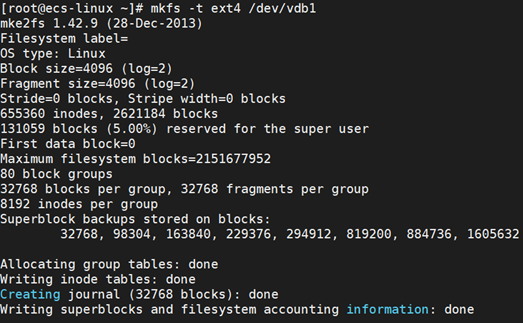 执行以下命令,把新建分区文件系统设为系统所需格式,mkfs -t 文件系统格式 /dev/vdb1,这里来设置文件系统为“ext4”为例:
