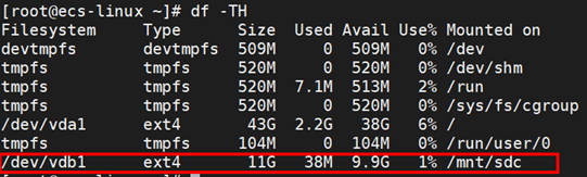 执行以下命令,把新建分区挂载到上步新建的挂载点下,这里还是挂载新建分区至“/mnt/sdc”为例: