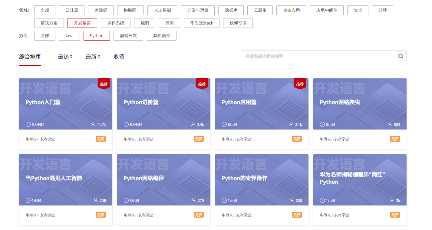 华为云课堂也会有众多免费的课程,帮助大家学习 Python,读者可以自行观看: