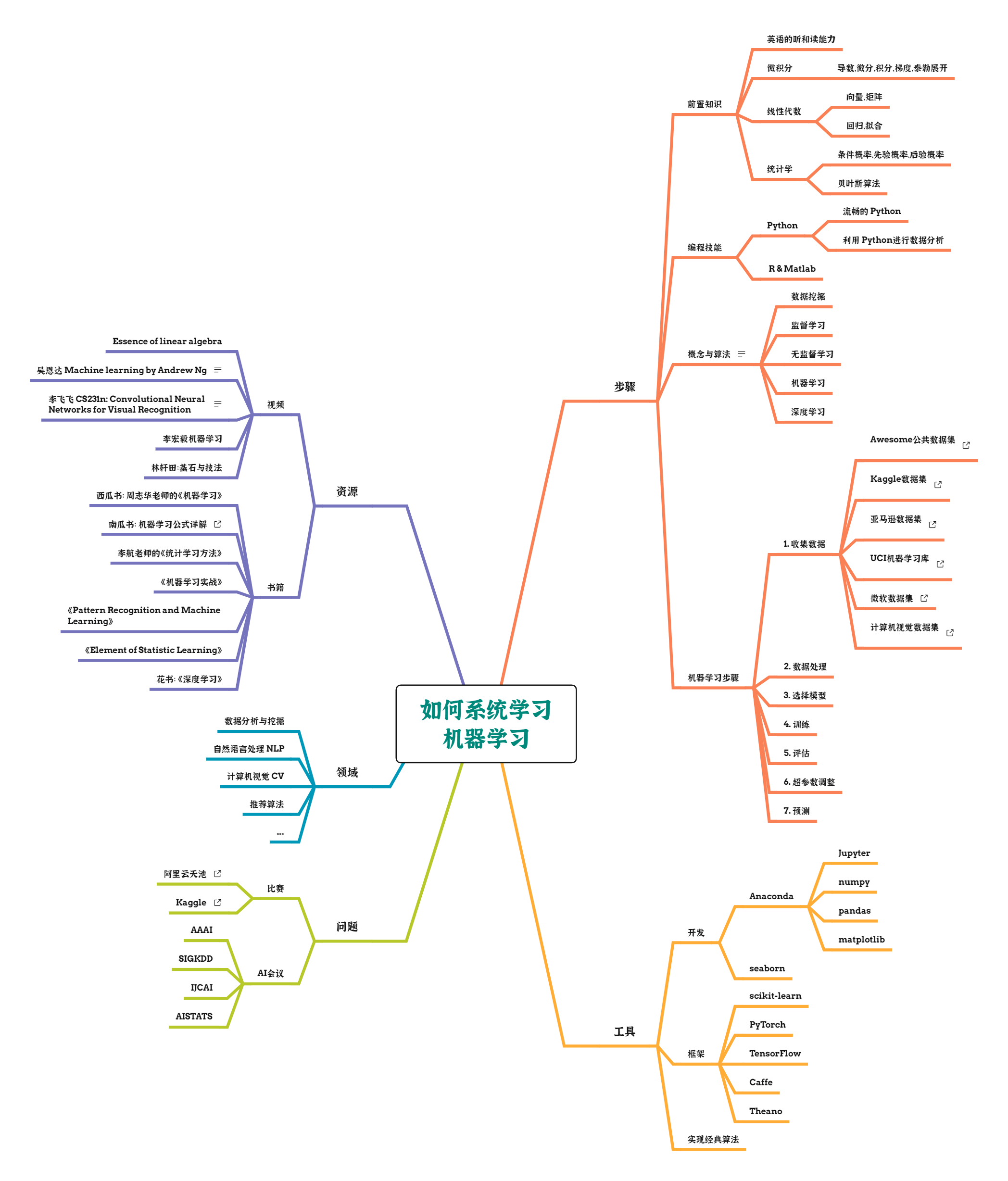 为了能够真正帮助到对机器学习感兴趣的同学,所以翻阅了网上众多的信息,结合自己读研期间的相关经历,整理出如下的这份关于如何系统学习机器学习的思维导图。