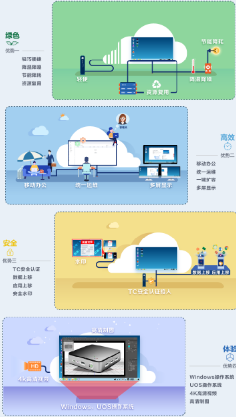 瘦终端是基于PC工业标准设计的小型行业专用商用PC,用专业嵌入式处理器、小型本地闪存、精简版操作系统,能够用于接入桌面;瘦终端将鼠标、键盘等输入传送到后台服务器处理,服务器再把处理结果返回给瘦终端连接的显示器显示,不同型号的瘦终端有不同的性能、外设接口、操作界面,可以灵活满足普通办公、高安全、高性能图形设计等使用场景; -
