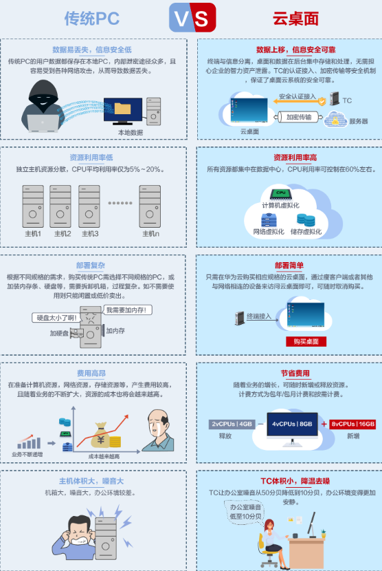 我们知道传统PC和VDI它需要大量的资金投入,并且部署和管理工作通常都比较复杂和困难。云桌面无需前期投资,亦无需对基础设施进行持续管理,只需支付一定的费用,便可享受一套完整的云桌面计算服务,包括计算、持久性存储,还能够让您以简单、经济实惠的方式为您的用户提供安全且具有丰富访问选项的桌面体验;