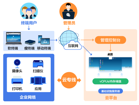 终端用户通过终端设备登录由管理员在云平台的管理控制台来买桌面,能0办公需求,并且可以通过云专线方式来用存储于企业网络中的网络应用,不懂没关系看下图理解下;