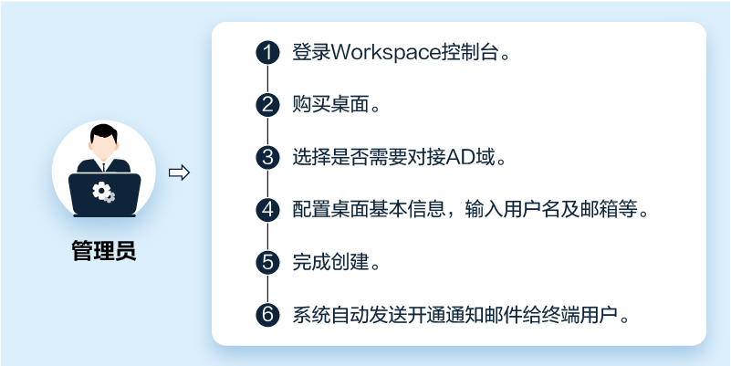 管理员通过控制台买桌面,买过程中支持选择是否对接AD域,并为具体用户分配桌面,购买成功后,系统自动推送桌面开通信息给终端用户;