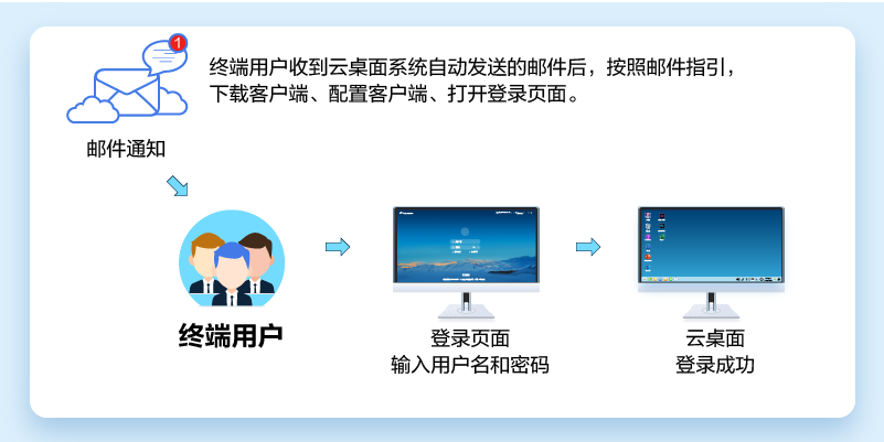 根据用户权限分为终端用户和管理员。终端用户即最终使用桌面的用户,具有登录、使用桌面的权限。管理员是租户,即为最终使用桌面的用户分配桌面的用户,具有购买桌面、删除桌面、以及设置策略、管理用户等权限这些; -