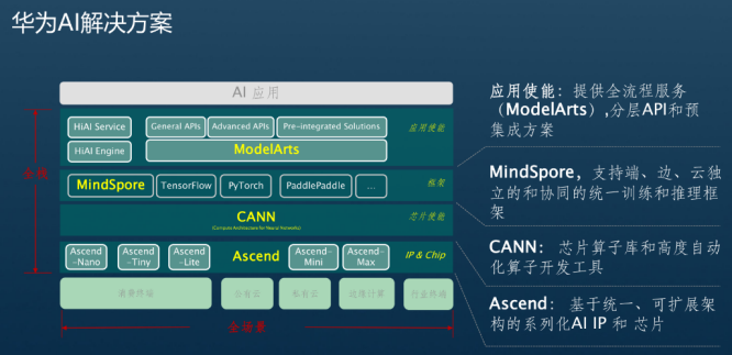 介绍ModelArts之前先介绍一下华为的AI解决方案,华为为开发者提供全栈的解决方案,从底层开始华为提供Ascend系列芯片,可用于不同需求的场景;往上就是CANN算子库,是高度自动化的算子开发工具;在AI开发框架方面,华为提供MindSpore框架,MindSpore是支持端、边、云独立和协同的统一训练和推理框架;再往上华为提供ModelArts集成式开发工具。