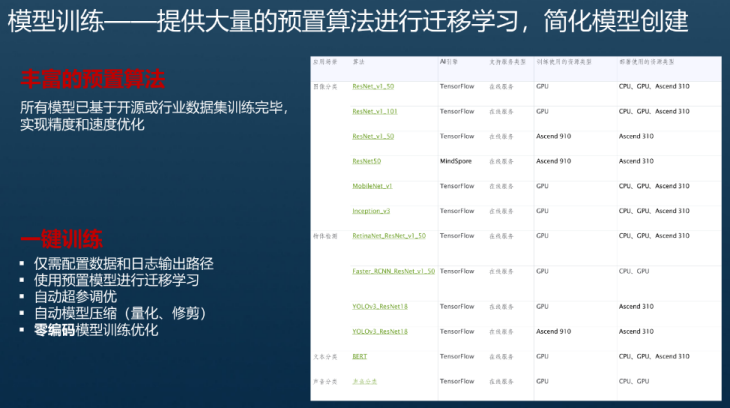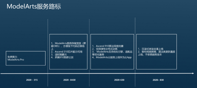 2020年3月ModelArts上线免费的算力资源,同时上线ModelArts Pro;2020年4月ModelArts 提供存储发放(屏蔽 OBS )方便线下代码迁移线上、Ascend 310芯片能力可用、适配鲲鹏云、昇腾910集群公测;2020年6月Ascend 910算法网络完善、支持弹性分布式训练、ModelArts支持优化引擎,适配运筹优化服务、ModelArts云服务上线华为云App;2020年8月沉浸式体验全量上线、架构彻底解耦,算法类更新直接上线,不依赖服务版本。