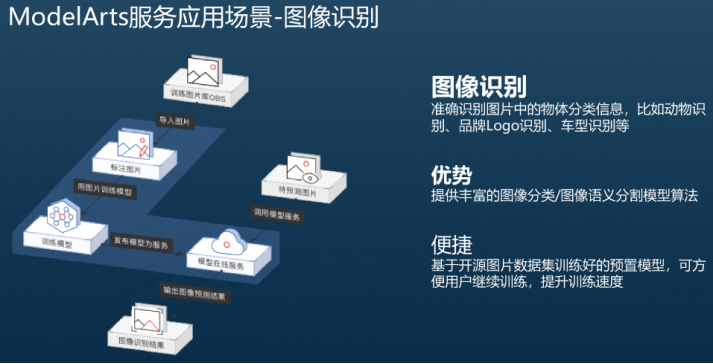 图像识别能够准确识别图片中的物体信息,常用的场景有车型识别、动物识别、花卉识别等。ModelArts能够提供丰富的图像分类/图像语义分割模型算法,基于预置算法进行模型训练有利于帮助开发者提升训练效果和训练速度。