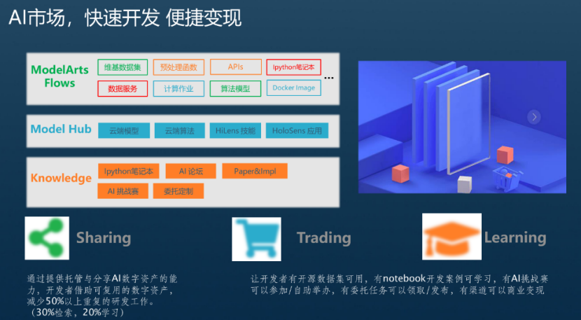 AI Gallery是在ModelArts的基础上构建的开发者生态社区,提供了Notebook代码样例、数据集、算法、模型等AI数字资产的共享,为高校科研机构、AI应用开发商、解决方案集成商、企业级/个人开发者等群体,提供安全、开放的共享及交易环节,加速AI资产的开发与落地,保障AI开发生态链上各参与方高效地实现各自的商业价值。