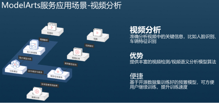 视频分析能够准确分析视频中的关键信息,比如人脸识别、车辆特征识别等,ModelArts能够提供丰富的视频检测/视频语义分析模型算法,基于预置算法进行模型训练有利于帮助开发者提升训练效果和训练速度。