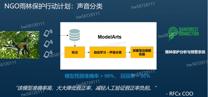雨林的面积是很大的,所以由人工的方式进行动物识别的工作量是很大的,华为云推出的解决方案是将动物的声音收集完成后通过ModelArts进行数据标注,然后通过自动学习进行模型训练,然后将模型部署至边缘服务器中,该案例能够大大减少人力资源的消耗,减少工作人员的工作量。