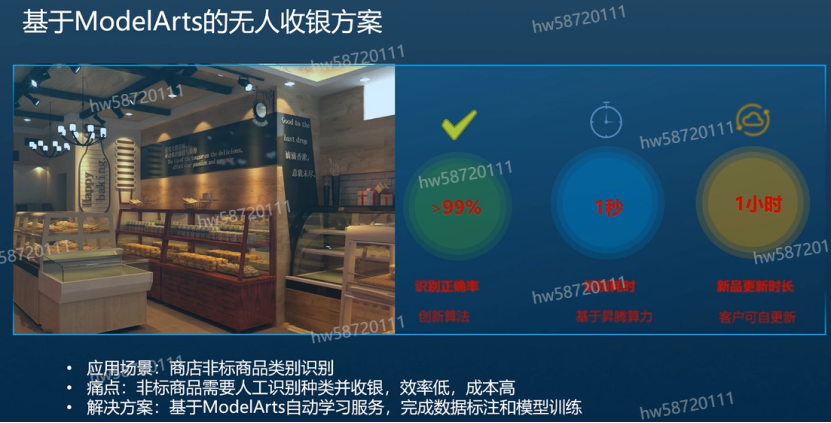 该案例是一个蛋糕店收银解决方案,该案例主要是为了解决商店里非标商品类别识别,因为非标商品需要人工进行识别并收银,效率低,成本高;该案例是通过ModelArts的自动学习服务完成,最终的模型效率高,识别精度高。