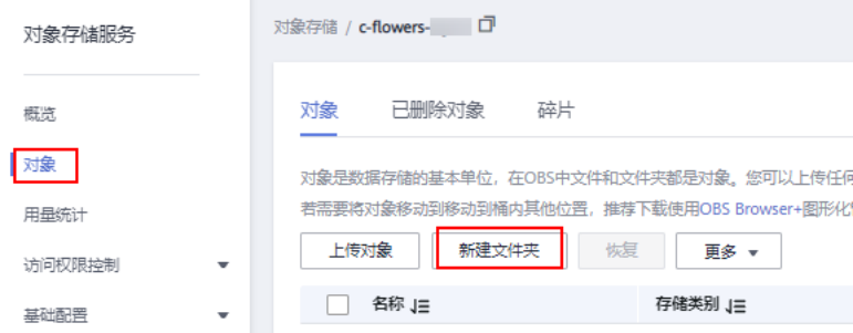 在桶列表页面,单击桶名称,进入该桶的概览页面。单击左侧导航的“对象”,在对象页面单击新建文件夹,创建OBS文件夹。例如,在已创建的OBS桶“c-flowers”中新建一个文件夹“flowers”。
