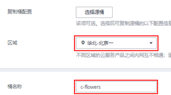 登录OBS管理控制台,在桶列表页面右上角单击“创建桶”,创建OBS桶。例如,创建名称为“c-flowers”的OBS桶。