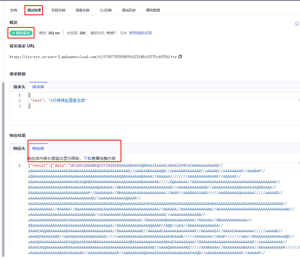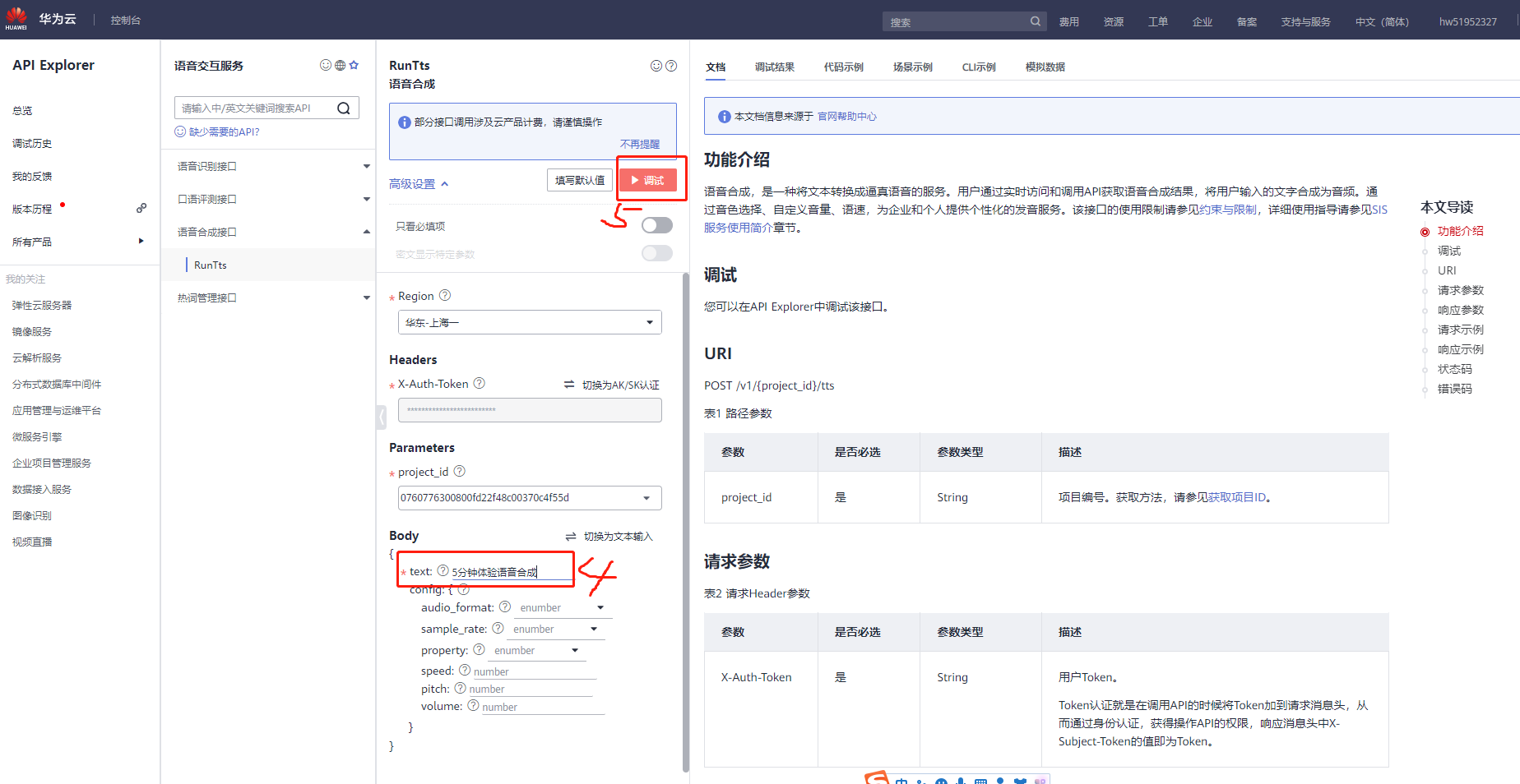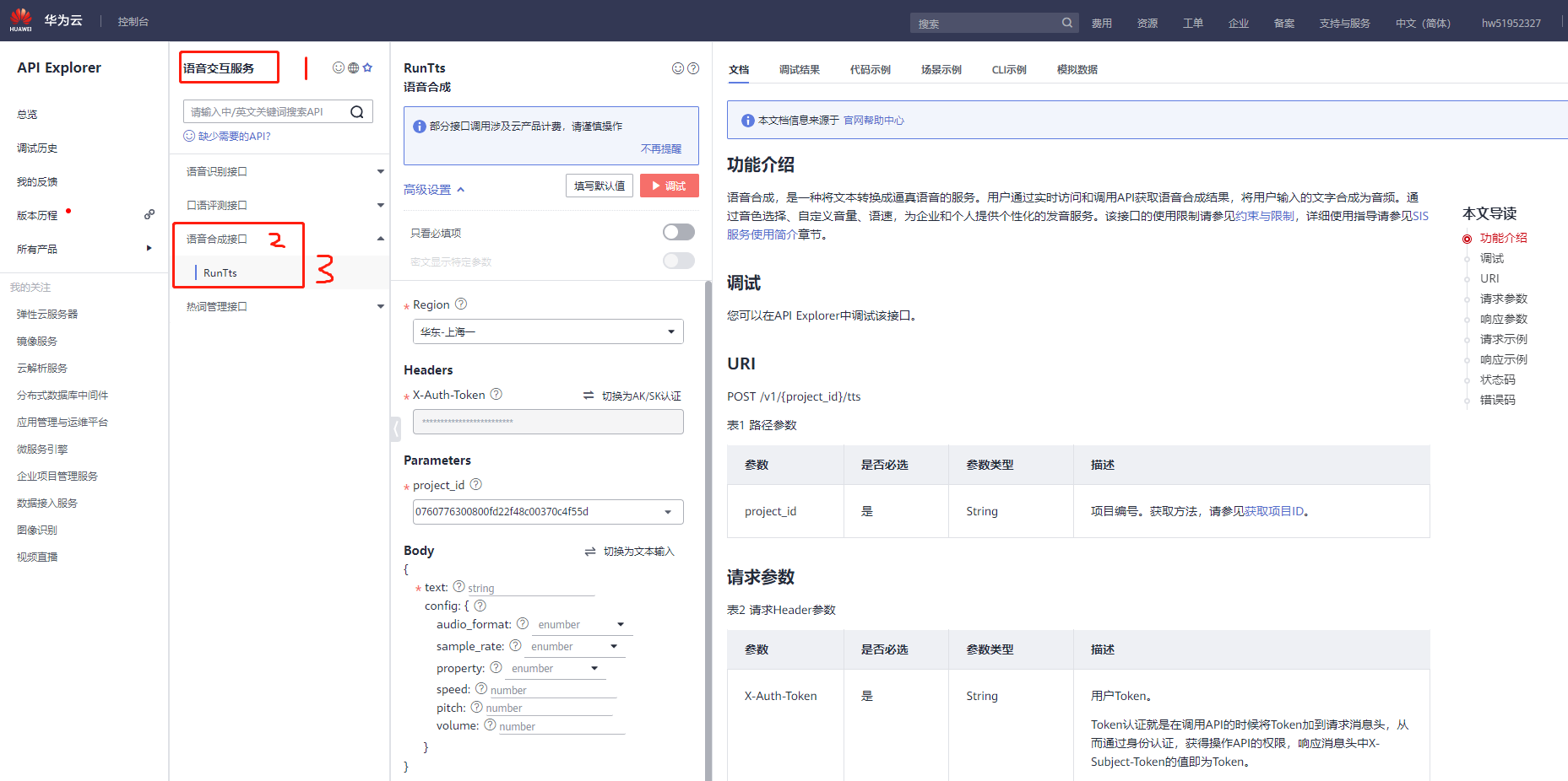 点击API Explorer_开发者社区-华为云 (huaweicloud.com),进入API Explorer页面,选择【语音交互服务--语音合成接口--RunTts】
