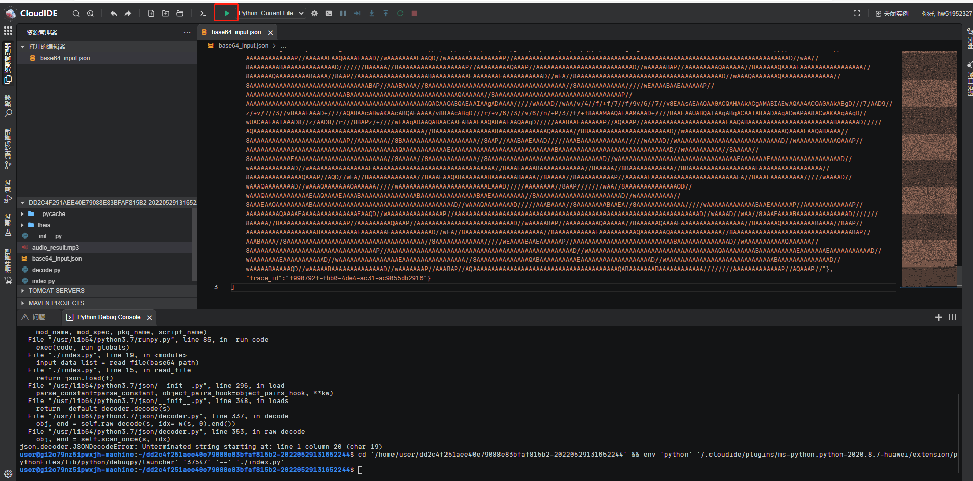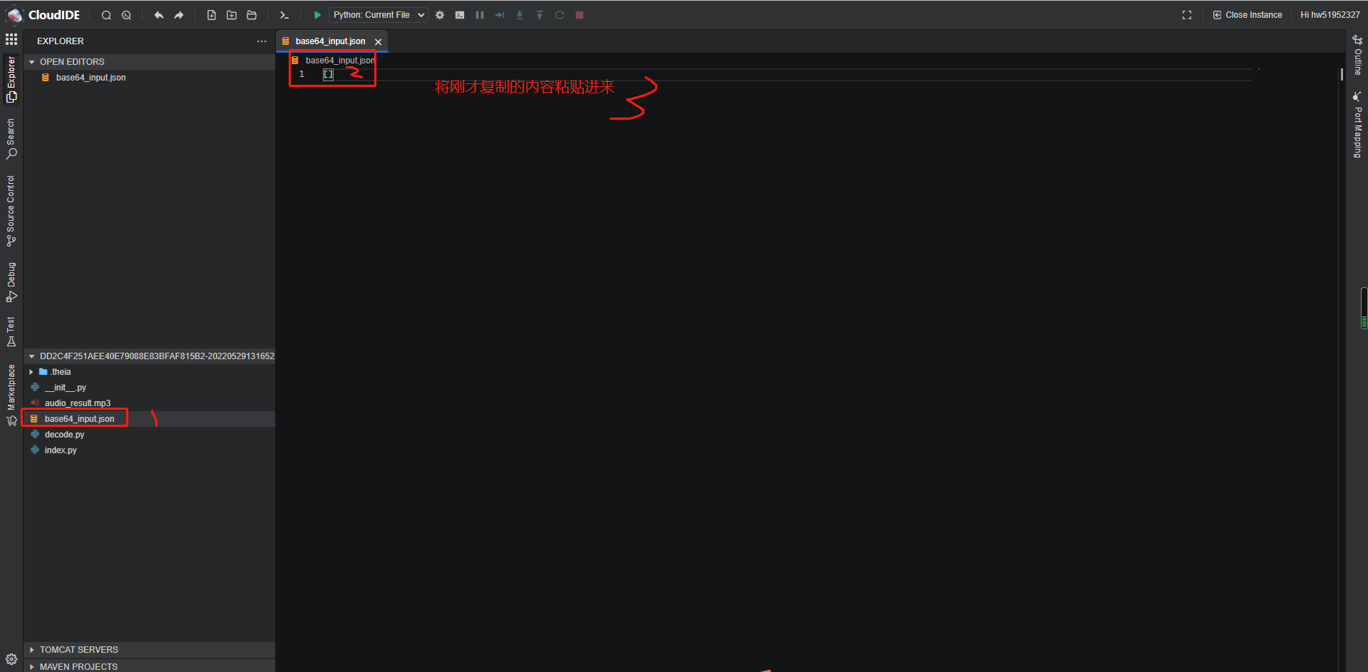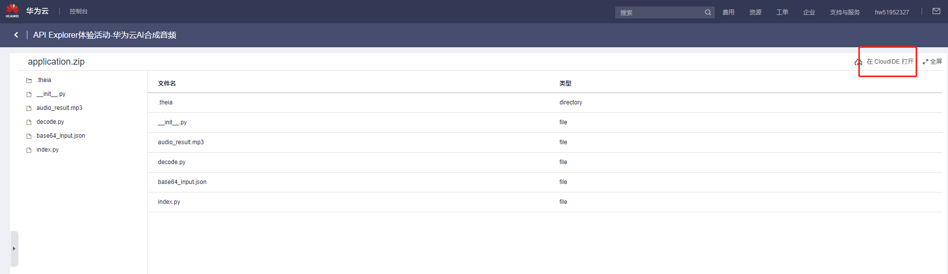 在成功界面,复制响应体内容,再打开华为云内置的CloudIDE,体验项目。(若未开通CloudIDE,进入CloudIDE_集成开发环境_WebIDE_华为云 (huaweicloud.com)点击【立即体验】免费开通即可)