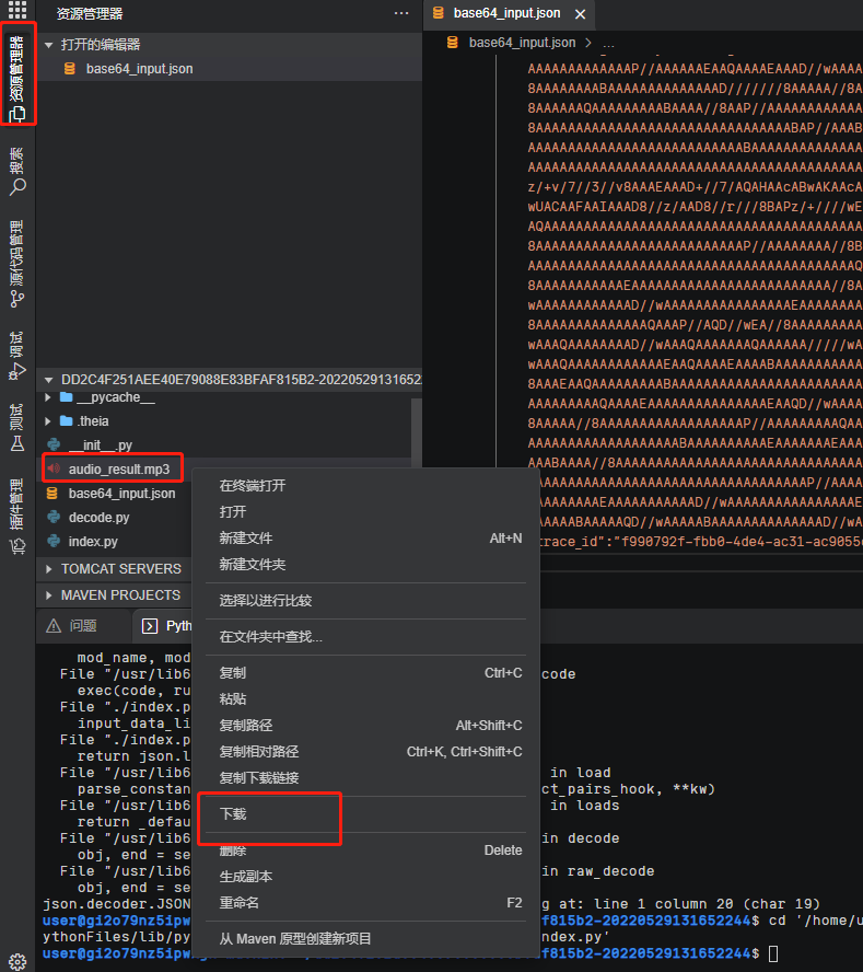 运行成功后,返回到Explorer下,选择mp3文件,右键,选择download。