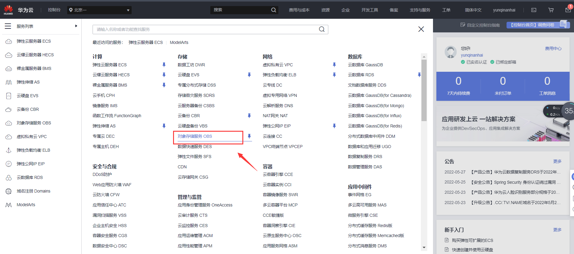 创建OBS桶将光标移动至左边栏,弹出菜单中选择“服务列表”->“ 存储”->“对象存储服务 OBS”,如下图: