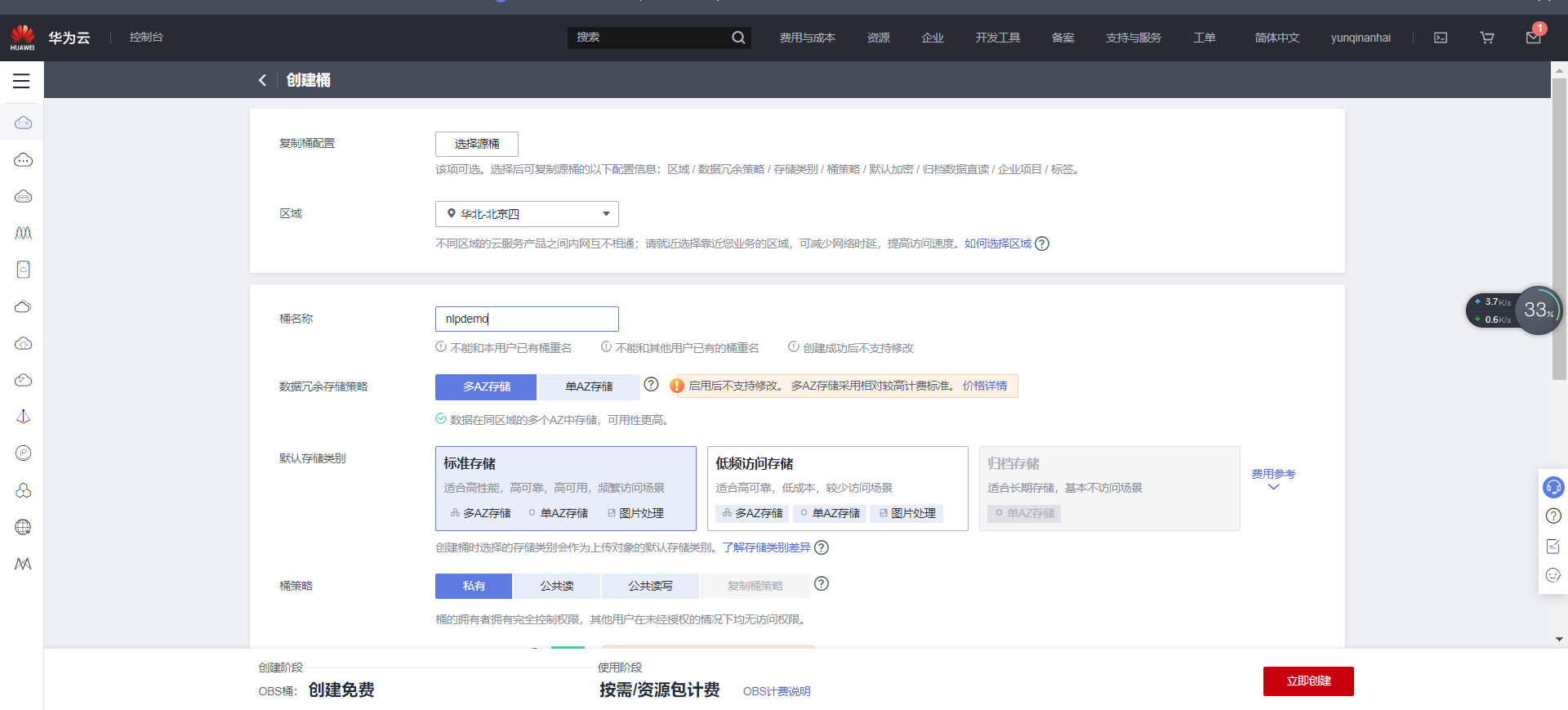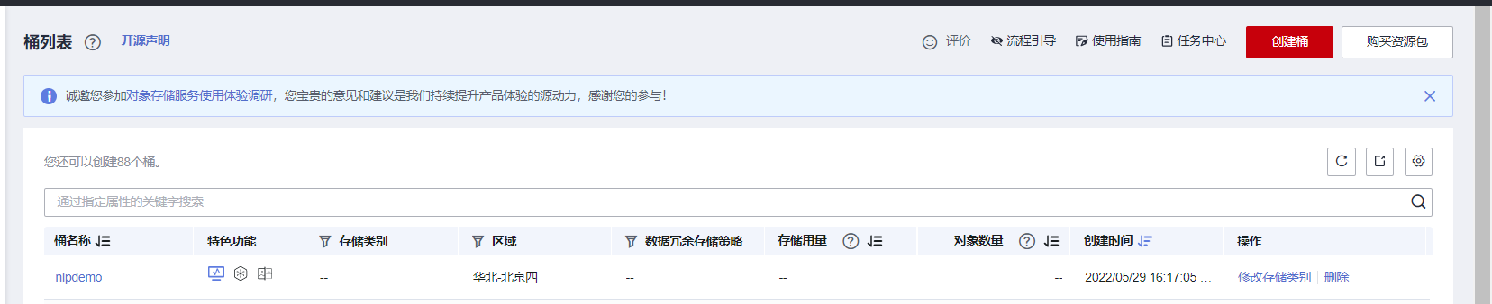 进去对象存储服务 OBS后,点击创建桶,配置参数如下:区域:华北-北京四,数据冗余存储策略:多AZ存储,桶名称:自定义(请记录,后续使用),存储类别:标准存储,桶策略:私有,默认加密:关闭,归档数据直读:关闭,点击“立即创建”,完成创建后跳转到桶列表,如下图所示: