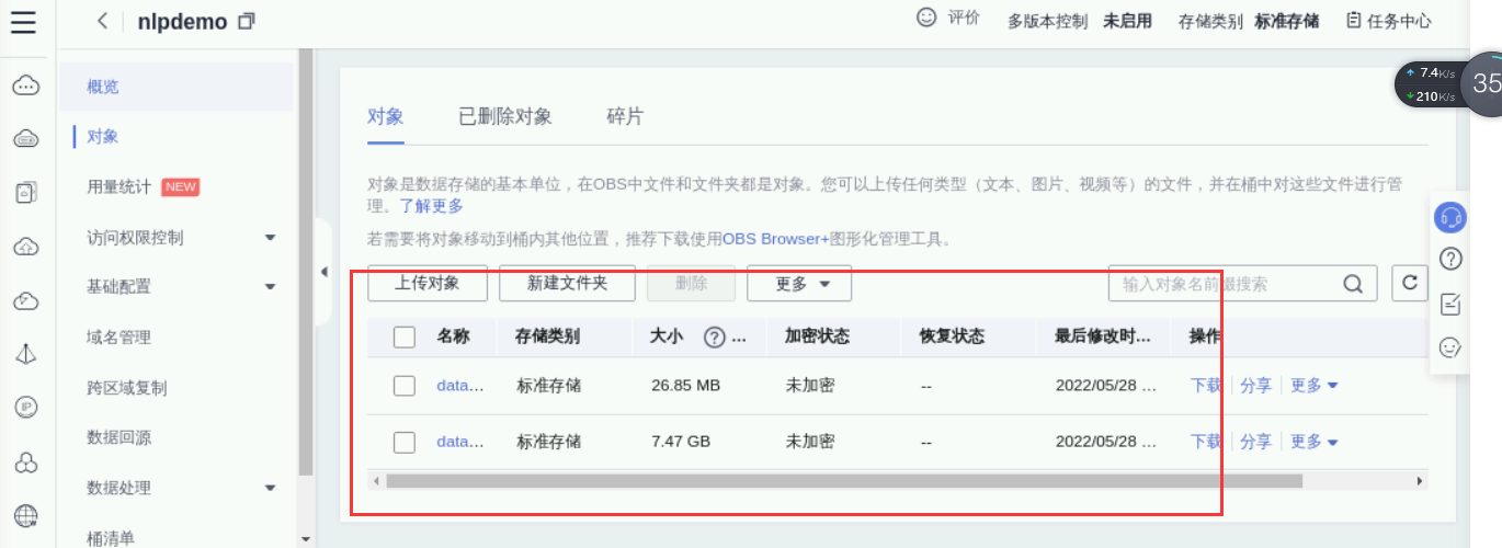 上传完毕后【大约60分钟,上传的速率较慢】建议华为云优化一下OBS的上传速度,在华为云控制台依次选择“控制台”->“服务列表”->“ 存储”->“对象存储服务OBS”,进入服务界面,点击创建的桶名称nlpdemo进入详情页,于页面左侧选择“对象”,点击后于页面右侧可查看到刚传入的资料,
