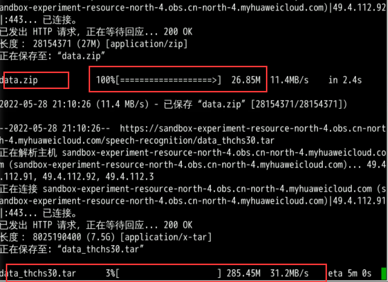 cd ../; wget https://sandbox-experiment-resource-north-4.obs.cn-north-4.myhuaweicloud.com/speech-recognition/data.zip; wget https://sandbox-experiment-resource-north-4.obs.cn-north-4.myhuaweicloud.com/speech-recognition/data_thchs30.tar