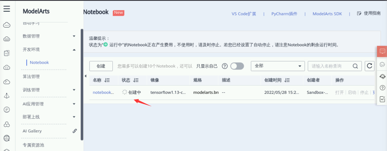 1) 创建Notebook在服务列表中找到并进入人工智能服务 ModelArts,然后点击ModelArts 页面中左侧的【开发环境】选项一点击【notebook】 进入notebook 页面。点击【创建】按钮进入创建页面,并按以下参数进行配置:名称:自定义,自动停止:自定义 12小时(在选择非[限时免费]规格后显示),