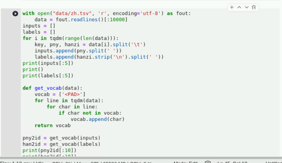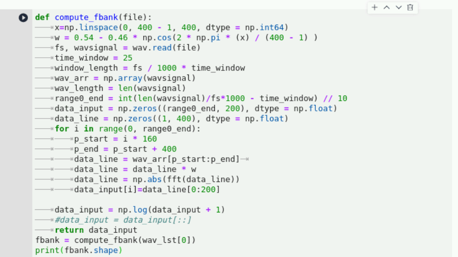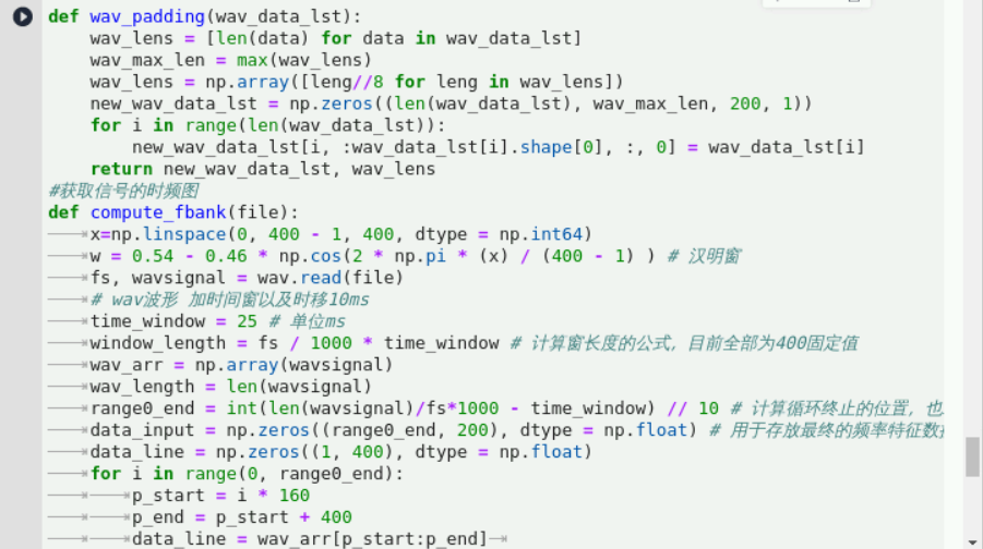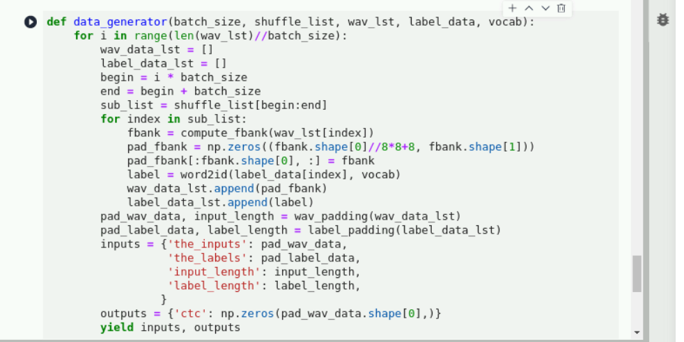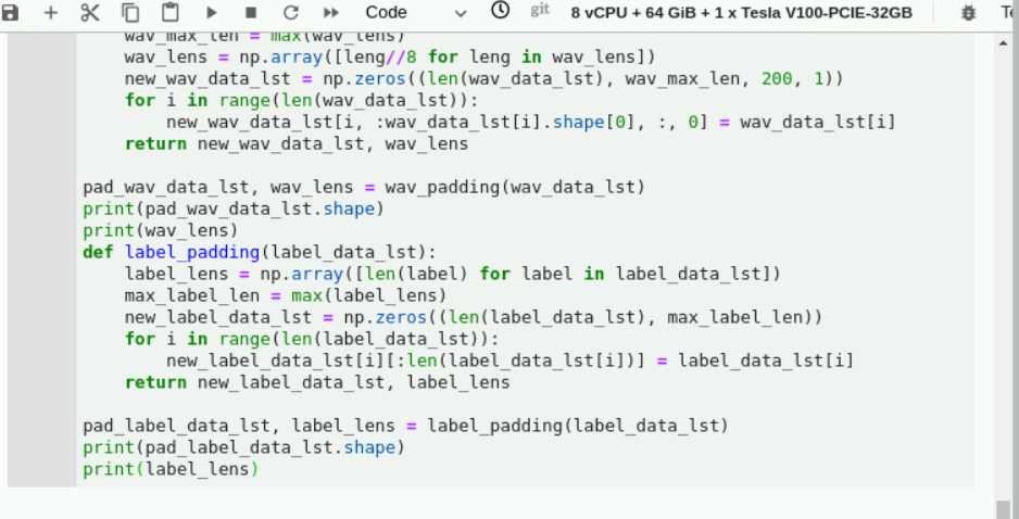 继续在下方空白的输入框中输入以下代码,生成音频文件和标签文件列表:注:考虑神经网络训练过程中接收的输入输出。首先需要batch_size内数据具有统一的shape。格式为:[batch_size, time_step, feature_dim],然而读取的每一个sample的时间轴长都不一样,所以需要对时间轴进行处理,选择batch内最长的那个时间为基准,进行padding。这样一个batch内的数据都相同,就可以进行并行训练了。