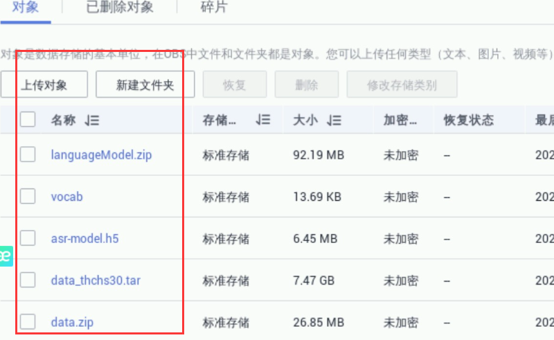 1).将本地准备的data.zip和语音数据包data_thchs30.tar上传到OBS中,为后续步骤准备。