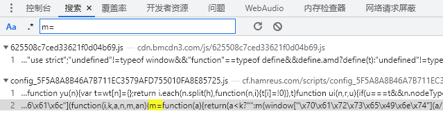 全局检索关键字 m=,查看所有搜索结果之后,最终定位到 config.js 文件,即下图代码高亮位置。
