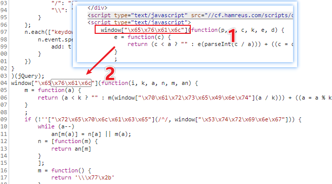 此时还是无法得到最终的答案,然后可以看到代码结构发现下述规律,即代码出现了相似的部分,并且都是 eval。
