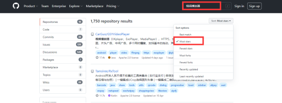 2.碰到没接触过的功能直接去github上面搜、搜的时候找star比较多的下载下来跑一下试试,学会用关键字检索,关键字一定要精简,这样你搜出来的内容匹配度才高,比如你搜一个开源视频功能组件,可以这样写:视频播放器,然后选择Most stars ,一般前几个都是主流的。