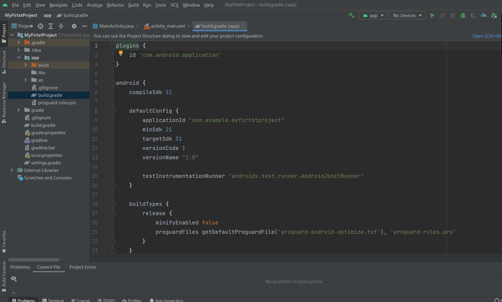 安装好后,根据提示下载相关的gradle,然后新建(备注:下一篇文章我们会详细介绍如何新建一个项目)或者导入一个现有的项目,构建环境就好。